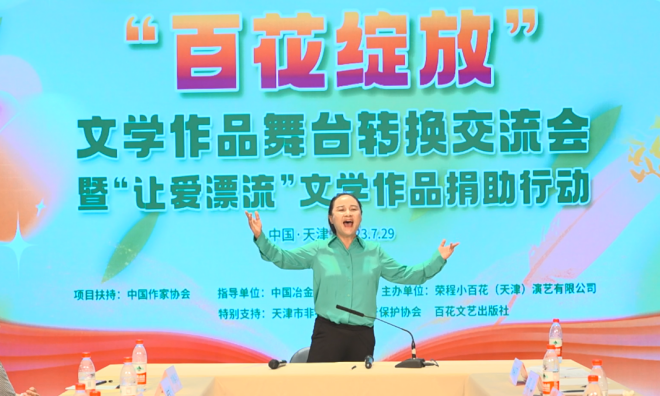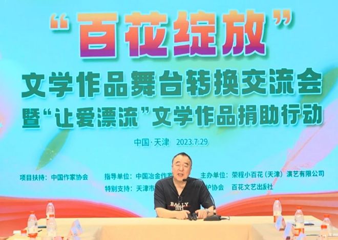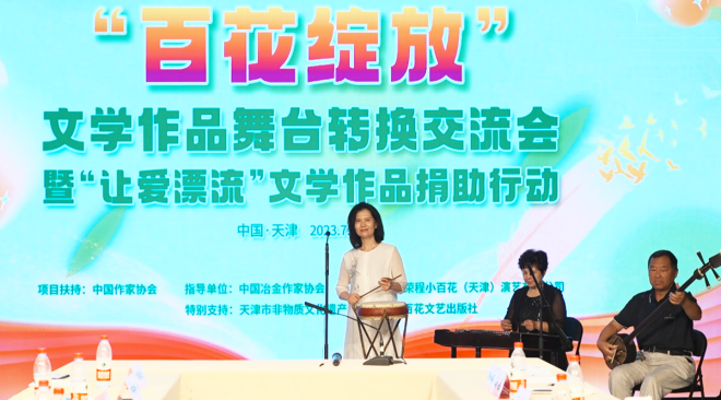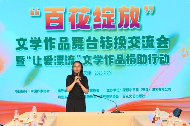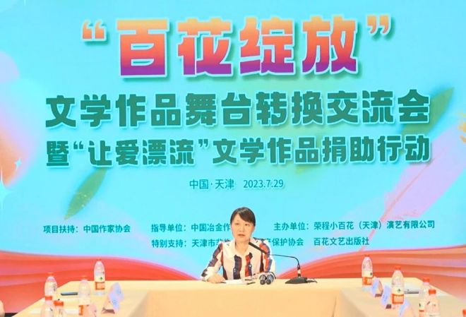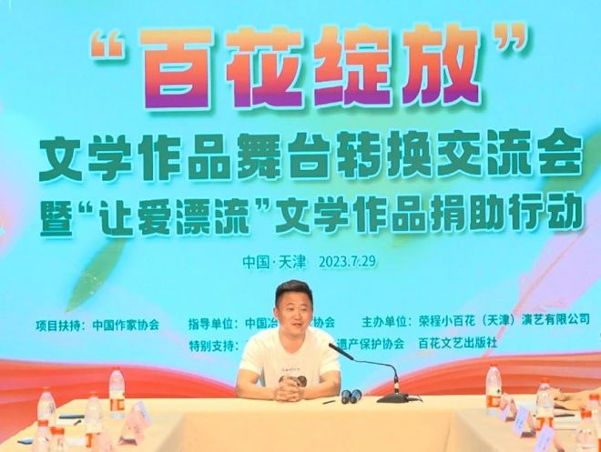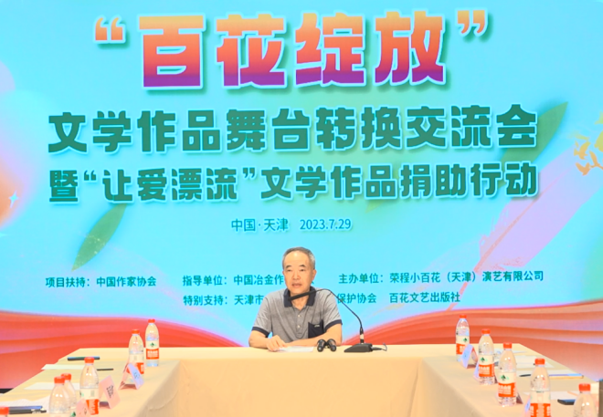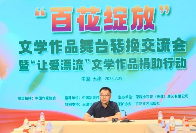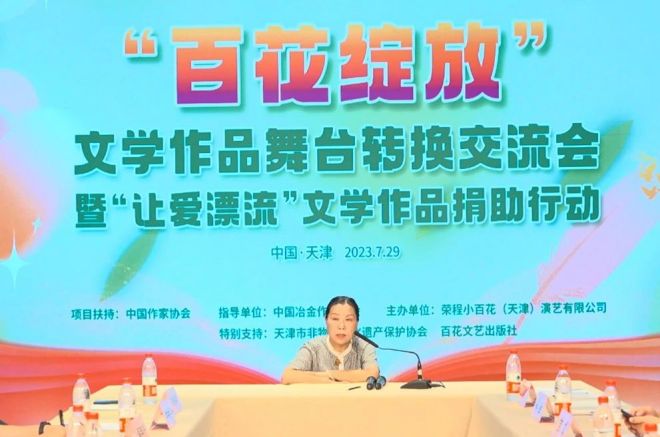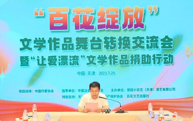 2023年7月29日上午,由中國作家協會項目扶持,冶金文學藝術協會、中國冶金作家協會指導,天津市非物質文化保護協會,百花文藝出版社特別支持,榮程小百花(天津)演藝有限公司主辦開展的“百花綻放”文學作品舞台轉化交流會暨“讓愛漂流”文學作品捐助行動在天津榮程小百花劇場圓滿舉辦。