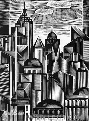 沈有福的版畫以表現工業題材而著稱。此作中我們可以看到不同種類、型號的工業管件、器具。它們的形狀千差萬別,構成了別具一格的視覺印象。畫麵黑白關係生動複雜,細節豐富耐看,形式上也較為整體統一。