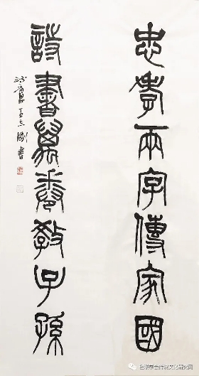 千qian年nian書shu法fa,但dan凡fan留liu有you足zu跡ji者zhe皆jie遺yi個ge性xing符fu號hao。然ran所suo謂wei創chuang新xin絕jue非fei玩wan弄nong小xiao聰cong明ming小xiao技ji巧qiao,惟wei有you將jiang前qian賢xian宗zong師shi之zhi書shu風feng筆bi格ge爛lan熟shu於yu心xin,潛qian移yi默mo化hua為wei己ji之zhi精jing神shen,方fang能neng有you所suo感gan悟wu,方fang敢gan談tan及ji創chuang新xin。誌zhi剛gang兄xiong即ji如ru此ci。其qi天tian賦fu異yi稟bing,且qie臨lin池chi不bu輟chuo,習xi篆zhuan治zhi印yin數shu十shi載zai,孜zi孜zi矻矻矻矻,苦ku心xin孤gu詣yi,大da有you成cheng就jiu。近jin年nian來lai又you苦ku苦ku探tan求qiu,融rong篆zhuan隸li筆bi意yi與yu簡jian帛bo趣qu味wei為wei一yi體ti之zhi新xin篆zhuan書shu,且qie始shi有you麵mian目mu,值zhi得de稱cheng道dao也ye。 文/趙國柱