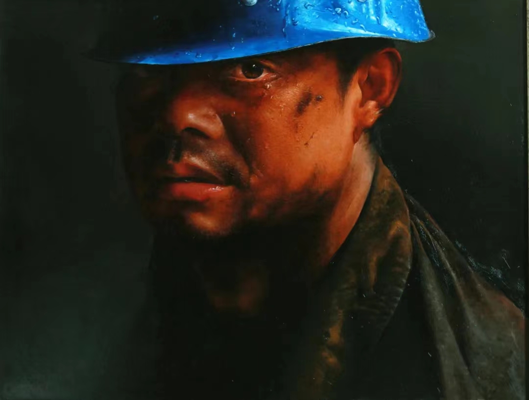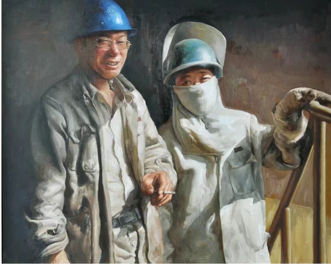 作品特點:用寫實的手法,對人物形象進行深入刻畫,畫麵加入了大量工業元素,再現了一線工人風采。